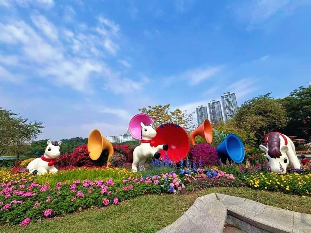 白天赏花,晚上看灯,在公园不同门口,还能打卡风格各异的马年主题装置!